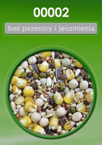 00002: 27% kukurydza żółta, 16% groch żółty, 11% peluszka, 10% sorgo, 8% proso, 5% kardi, 5% owies bezłuskowy, 4% dari, 4% gryka, 3% słonecznik, 3% ryż łuskany, 2% wyka, 1% fasola mungo, 1% kanar.